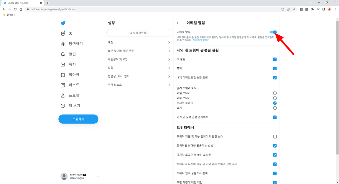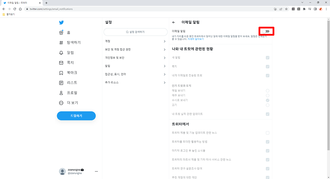 이메일 알림에 활성화되어 있는 버튼을 비활성화해주시면 됩니다. 이메일 알림과 관련되어 필요한 내용만 활성화하시면 되는데 저는 트위터에서 전체 메일 알림이 오지 않도록 하기 이메일 알림 자체를 비활성화했습니다.