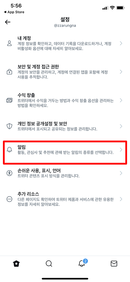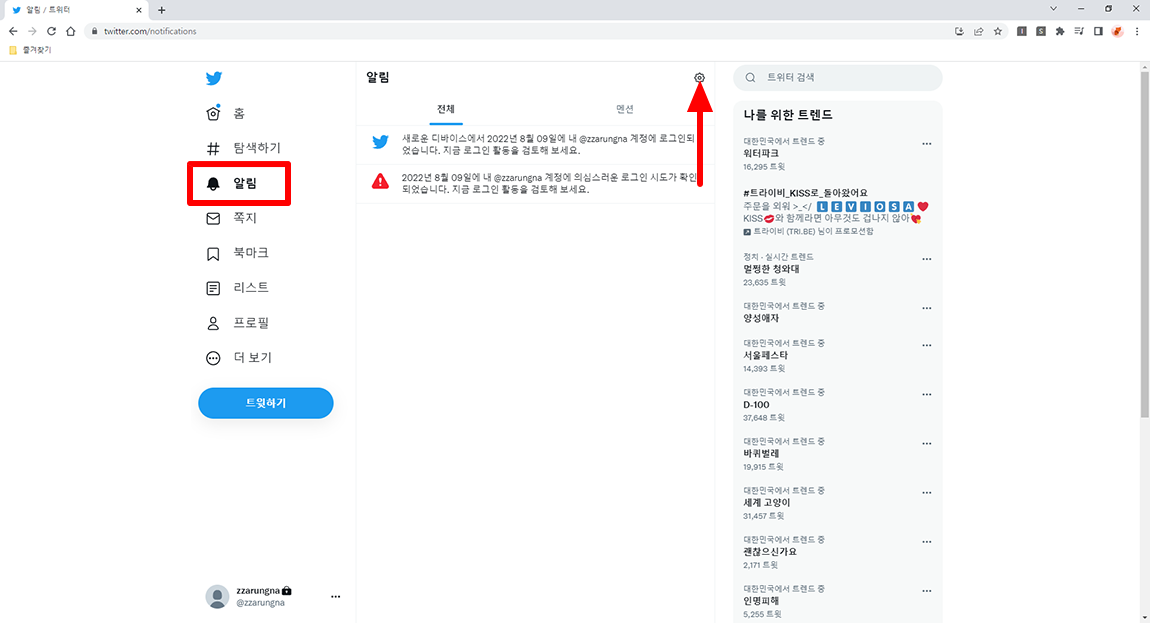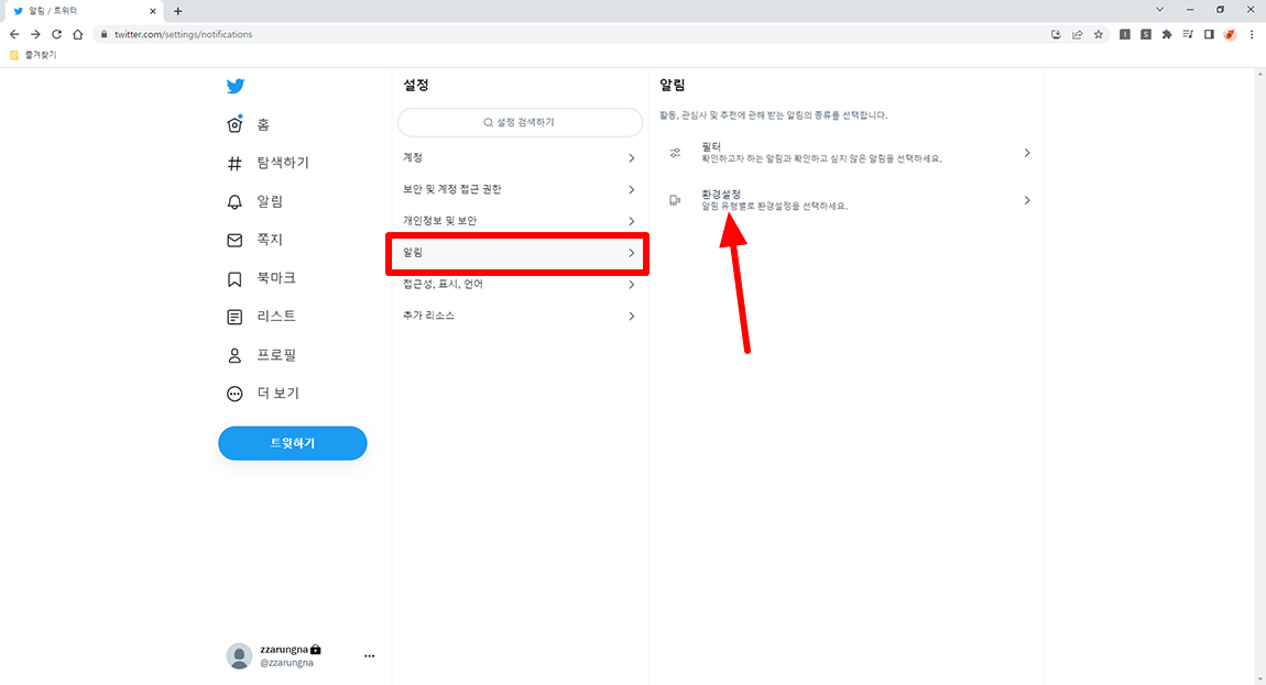 PC 환경에서 트위터 사이트에 접속하 신 후 https://twitter.com/home?lang=ko 왼쪽 알림 메뉴 선택 하시고 톱니바퀴 모양의 설정 아이콘을 선택하시면 됩니다.