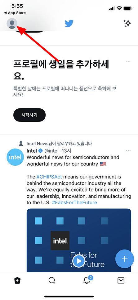 모바일 작성 기준은 아이폰 XR 기준입니다만 메뉴 구조에 큰 차이가 없으니 안드로이드 사용하시는 분들도 사용방법은 같습니다. 먼저 왼쪽 상단에 프로필 아이콘 선택.