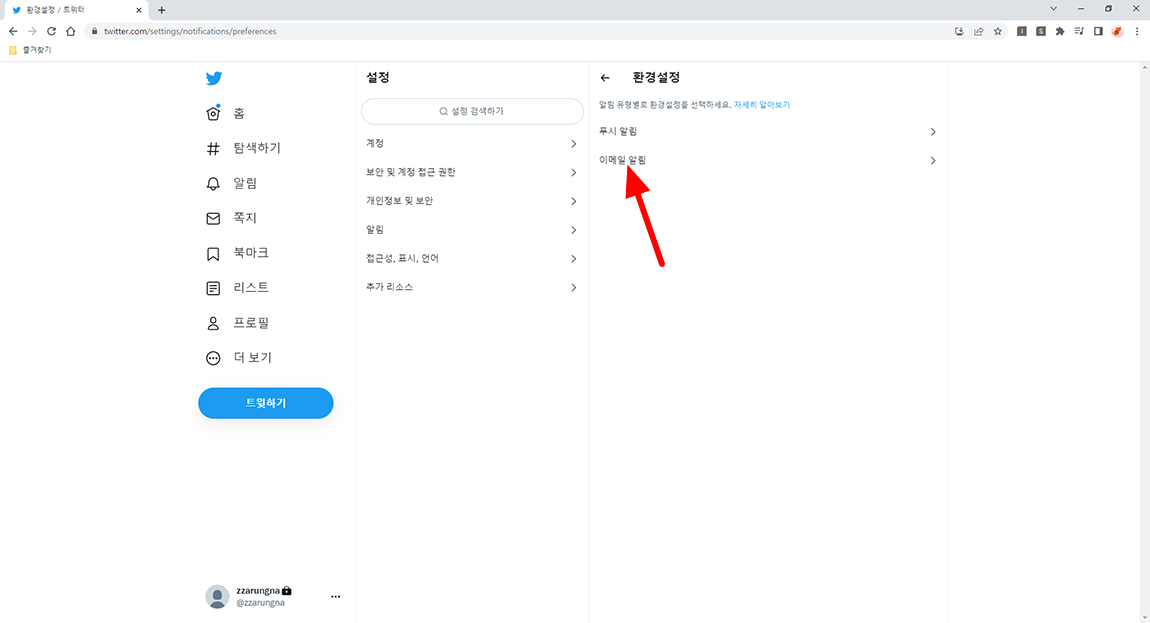 PC 환경에서 트위터 사이트에 접속하 신 후 https://twitter.com/home?lang=ko 왼쪽 알림 메뉴 선택 하시고 톱니바퀴 모양의 설정 아이콘을 선택하시면 됩니다.