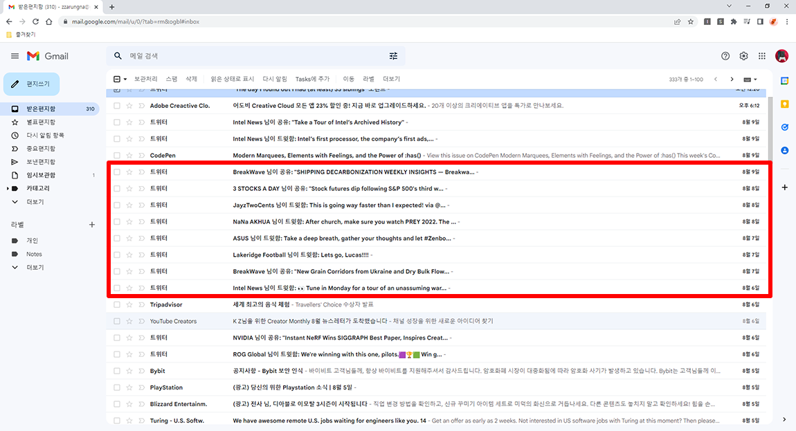 제가 주로 사용하는 이메일 계정으로 가입된 트위터 계정이 있어 트윗 관련 메일이 매일매일 쌓이고 있더군요. 계속 신경 쓰지 않고 방치했었는데 어는 날 트위터 메일을 차단해야겠다는 생각이 들었습니다.
