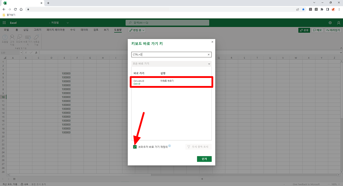 웹 오피스365 엑셀 ctrl+d 단축키 설정방법