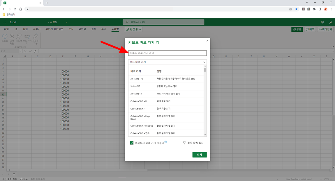 웹 오피스365 엑셀 ctrl+d 단축키 설정방법