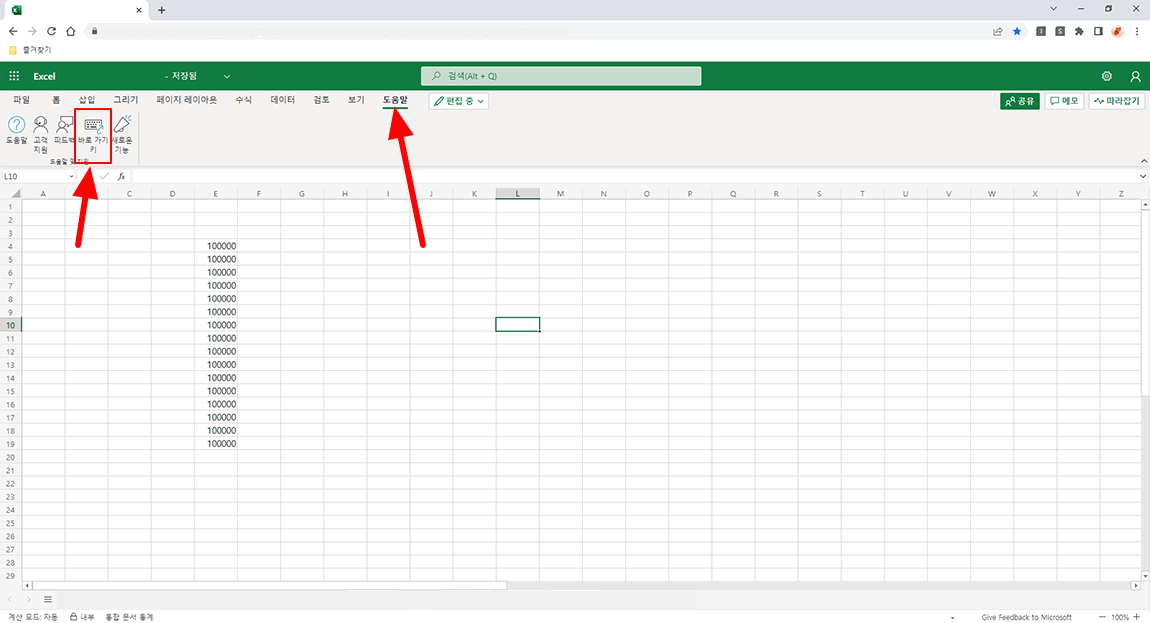 해결 방법은 간단합니다. 웹에서 실행되고 있는 엑셀 화면에서 도움말 메뉴를 선택하시고 바로 가기 키 메뉴를 선택하시면 됩니다.