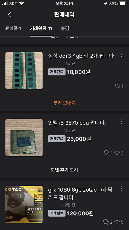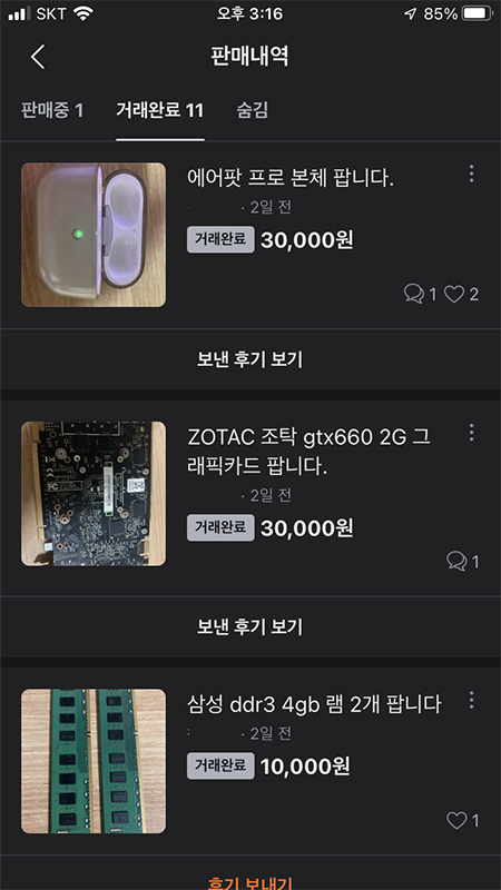 시간이 꽤 지난 중고 물품이기에 문제가 있으면 환불해 드린다고 하며 집에서 자리만 차지하고 있던 모든 물품을 판매했습니다. 사람들과 트러블도 없었으며 중고 물품을 모두 정리하니 재밌기도 하며 후련했습니다. 거래 완료로 표시된 금액보다 조금 깎아서 팔았습니다. 그러니 당근마켓에서 판매된 금액보다 만원~이만원 싸게 거래된 물건들이 매우 많을 거라는 생각을 했습니다.