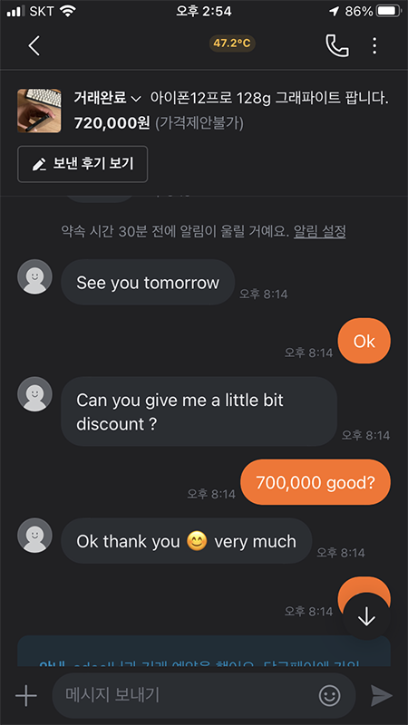 720,000원에 올렸던 아이폰12 프로는 만나기 전 700,000원까지 깎았으며 지하철 안에서 만난 파키스탄인은 액정에 기스가 너무 많다며 사장한테 전화해본다고 하더군요. 그렇게 전화를 하고 670,000원에 사야 한다며 얘기하더군요. 전 잠시 망설이며 핸드폰을 다시 파는 시간에 그냥 헐값에 넘기는 게 낫겠다는 생각에 넘겼습니다.