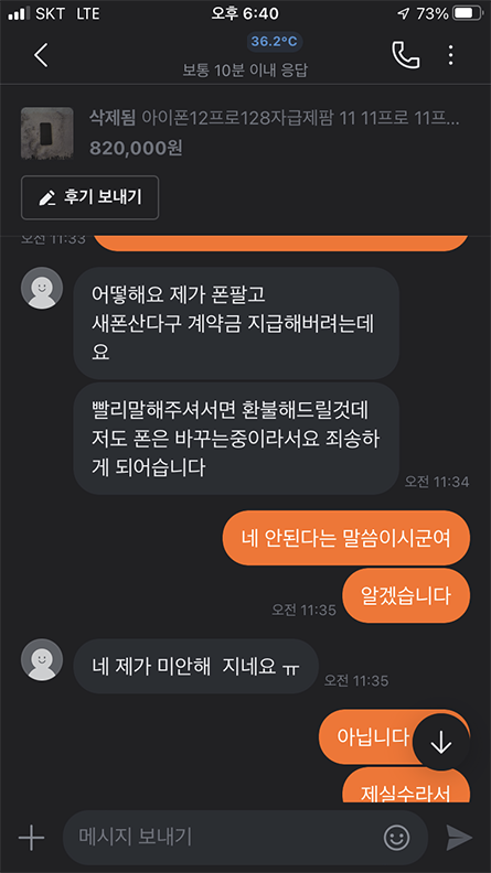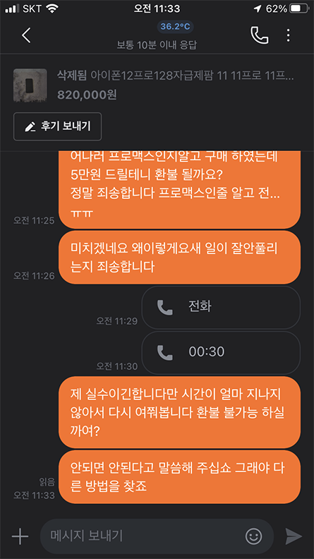 물론 판매자도 굉장히 억울한 상황이고 그 짧은 사이에 다른 핸드폰 계약금을 지불해 환불을 못 해주는 상황이었을 수 있습니다. 실수로 구매하고 환불을 요구한 저의 잘못이라는 생각이 컸습니다.