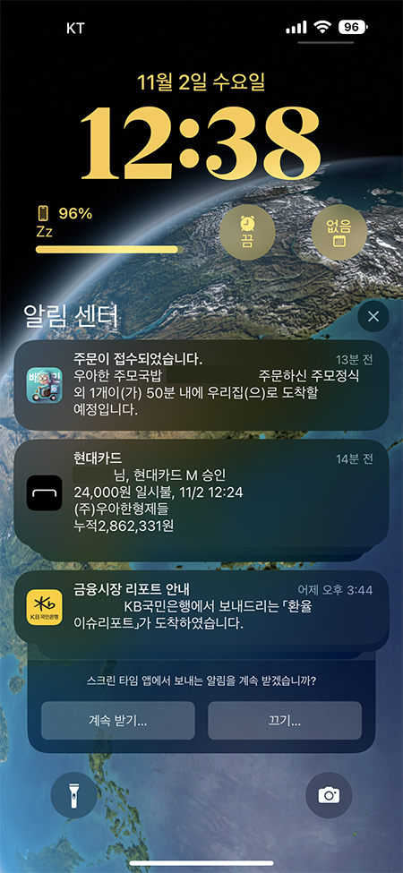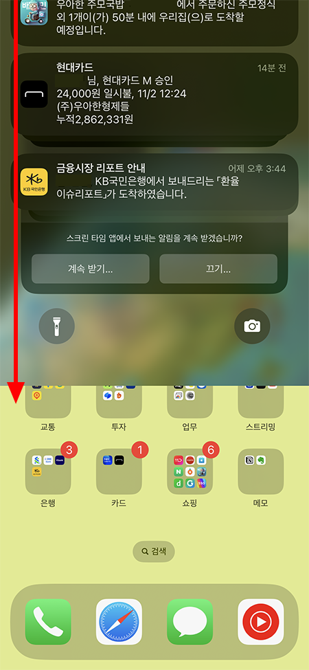 그럼 잠긴 화면에서 숨겨져 있는 알림 목록이 모두 표시되게 됩니다. 잠긴 화면에서 알림 센터를 확인 하실 수 있으며 스마트폰 잠금이 해제된 상황에서도 알림을 확인하실 수 있습니다.