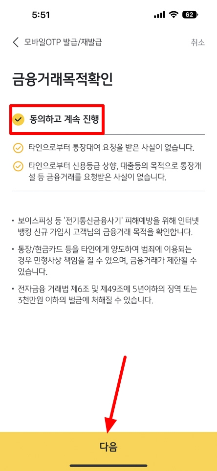 다음. 확인 버튼을 눌러 모바일 OTP 신청을 완료하시면 됩니다.