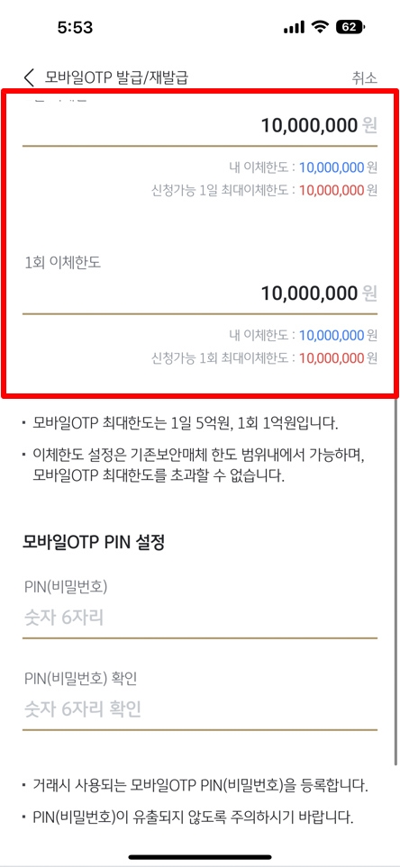 처음 모바일 OTP 발급 시 이체 한도를 지정해야 합니다. 최초 이체 한도는 10,000,000원으로 OTP 신청 이후 일일 이체 한도를 변경하셔야 합니다. 우선은 천만원으로 설정하시고 다음으로 넘어가시면 됩니다. PIN 번호로 인증 과정이 처리되니 핀 번호는 반드시 기억해 놓으세요.