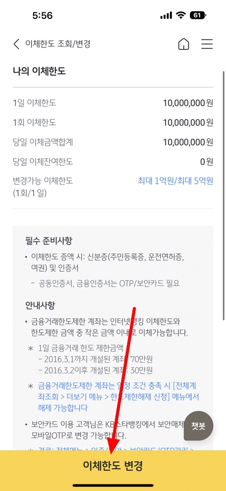 국민은행 일일 이체 한도 변경 방법