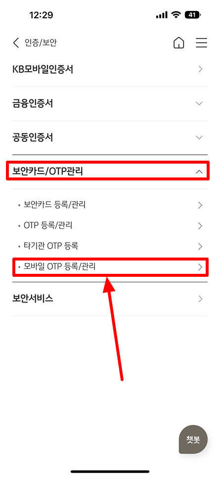 그리고 보안카드/OTP 관리 메뉴를 선택하시면 하위 메뉴가 열리며 이곳에서 모바일 OTP 등록/관리를 선택해 주시면 됩니다.