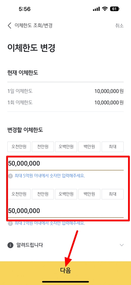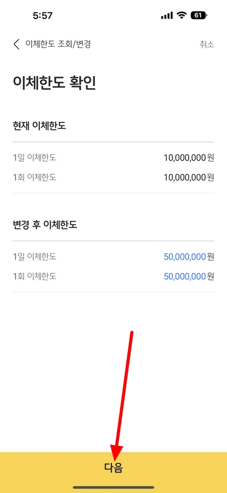 그럼 아래 이미지와 같이 이체 한도가 10,000,000원에서 50,000,000원으로 변경된 것을 확인하실 수 있습니다. 다음 선택.
