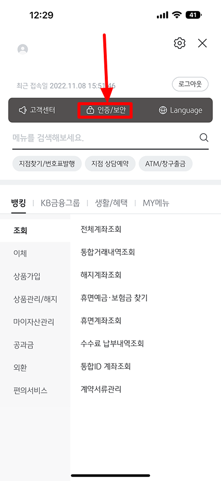 여러 가지 메뉴가 나오는데 여기서 인증/보안 버튼을 선택하시면 됩니다.