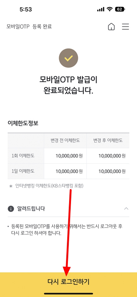 이제 모바일 OTP 신청 및 등록은 완료되었습니다. 다시 로그인하기 메뉴를 눌러 재로그인 해주시면 됩니다.