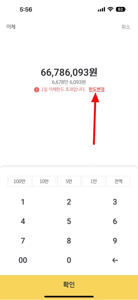 이체 과정을 이용해 10,000,000원 이상 이체를 해보면 아래 이미지와 같이 한도 변경 메뉴가 표시되게 됩니다. 한도 변경 메뉴를 선택하시면 됩니다.