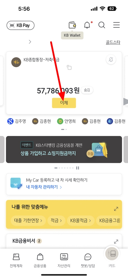 모바일 OTP 등록을 완료했으니 이체 한도를 변경해야 합니다. 메인 화면에서 이체를 눌러 주세요.