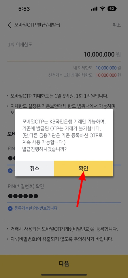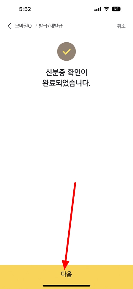다음. 확인 버튼을 눌러 모바일 OTP 신청을 완료하시면 됩니다.