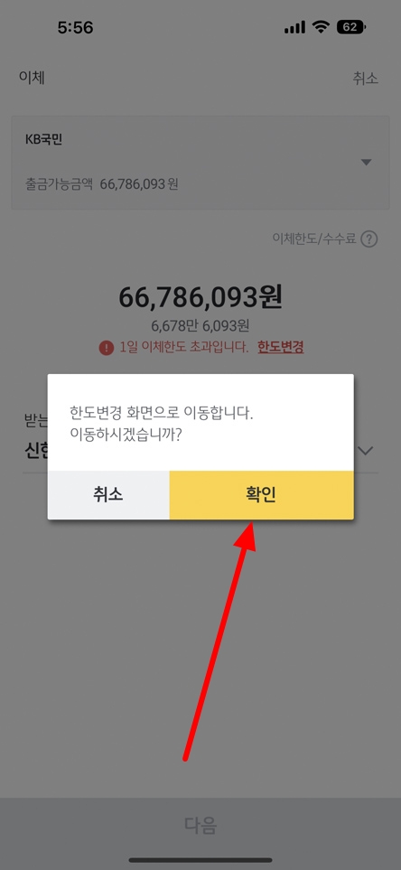 이체 과정을 이용해 10,000,000원 이상 이체를 해보면 아래 이미지와 같이 한도 변경 메뉴가 표시되게 됩니다. 한도 변경 메뉴를 선택하시면 됩니다.