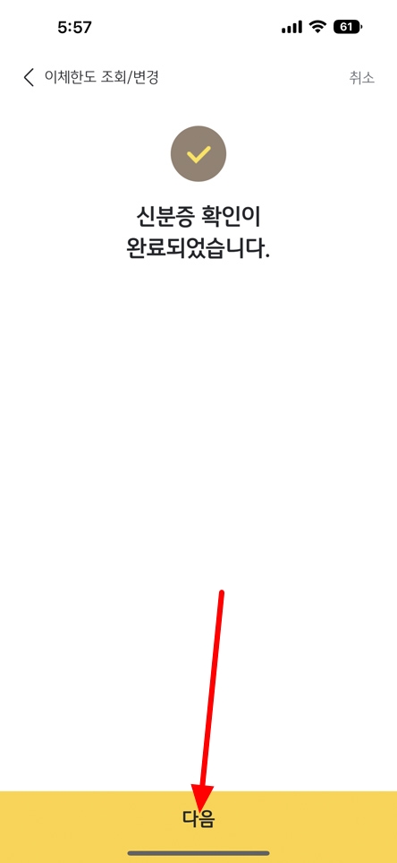 이체 한도 변경 시에도 추가로 신분증 확인이 필요합니다. 신분증 촬영 후 잘못된 글자나 숫자가 있다면 수정하시고 다음 진행하시면 됩니다.