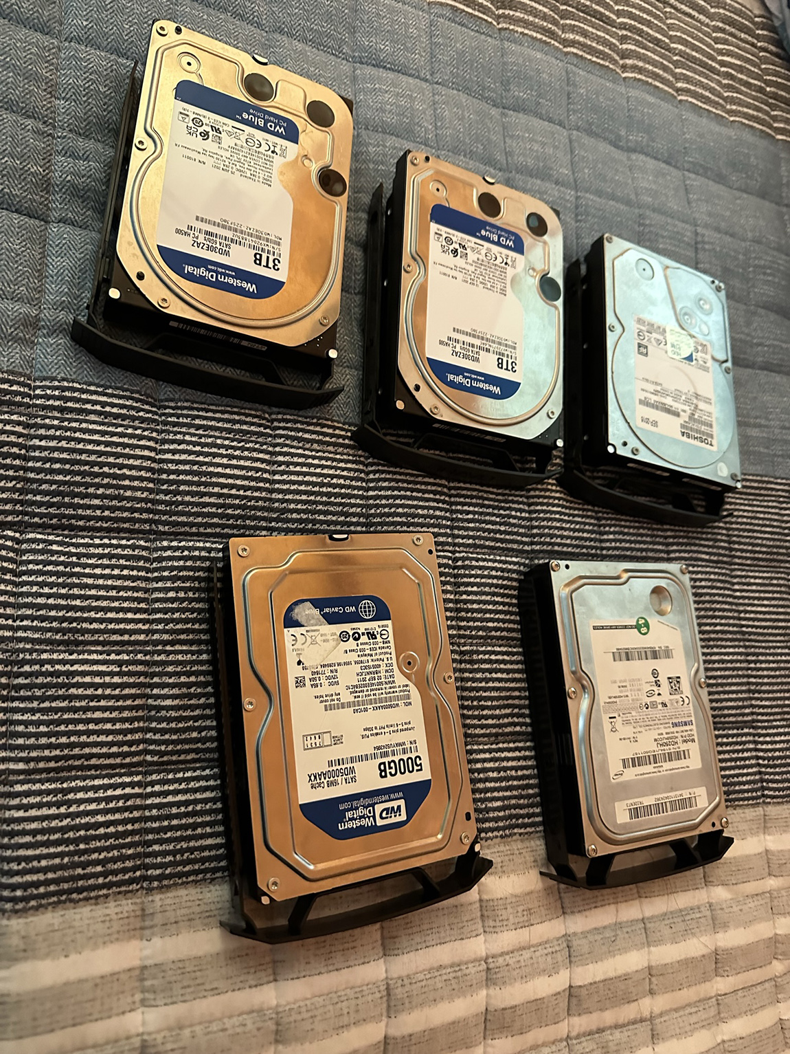 4번의 경우 SATA SSD, NVME SSD, 용량이 넉넉한 하드 디스크로 교체 하게 되면 금액적으로 꽤 많은 금액이 지출되겠지만 가장 안정성이 높고 PC 구성도 변경할 필요도 없어 여유 있을 때 하나씩 교체하시면 됩니다. 저도 아래 이미지와 같이 예전 하드 디스크까지 총 5개의 하드가 있었지만 1TB 미만의 하드 디스크는 모두 버리고 3TB 하드 디스크 3개만 남겨 놓았습니다.