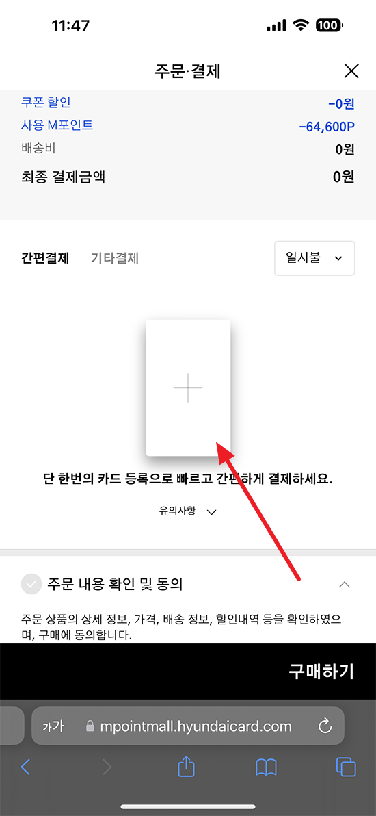 포인트 사용에 체크가 되어 있는지 확인하시고 포인트 사용이 선택된 상태에서 구매하기 버튼을 누르시면 현대카드 포인트가 쌓인 신용카드를 연결하실 수 있습니다.