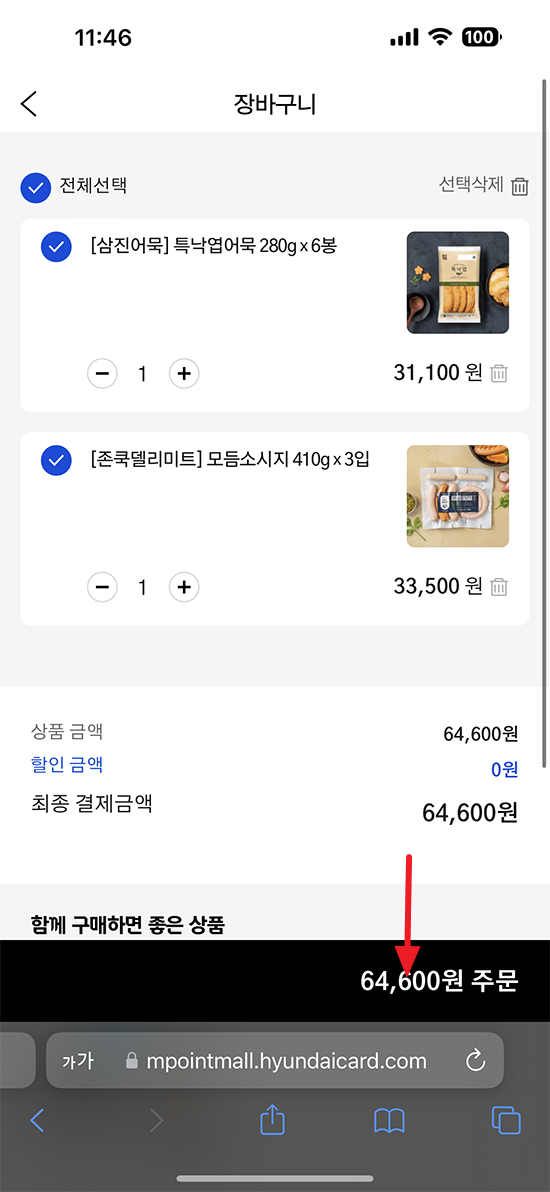 이것저것 둘러보다가 그냥 먹는 거로 포인트를 다 써버리기로 결정했습니다. 소시지랑 어묵이 한눈에 보여서 두 상품을 포인트만으로 사용해 결제하려고 합니다.