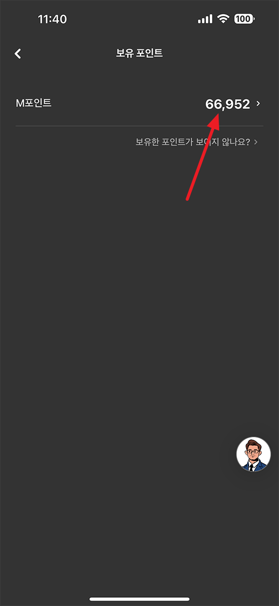 메뉴 중 아래로 스와이프하시다 보면 나만의 혜택 메뉴에 보유 포인트가 메뉴가 있습니다. 보유 포인트 메뉴 선택.