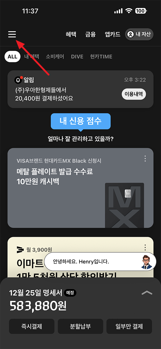 현대카드 앱을 실행하시고 메뉴 버튼을 눌러 주세요.