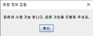 JOptionPane.showMessageDialog(null, "회원만 사용 가능 합니다. 회원 가입을 진행해 주세요..", "회원 정보 없음.", JOptionPane.DEFAULT_OPTION);