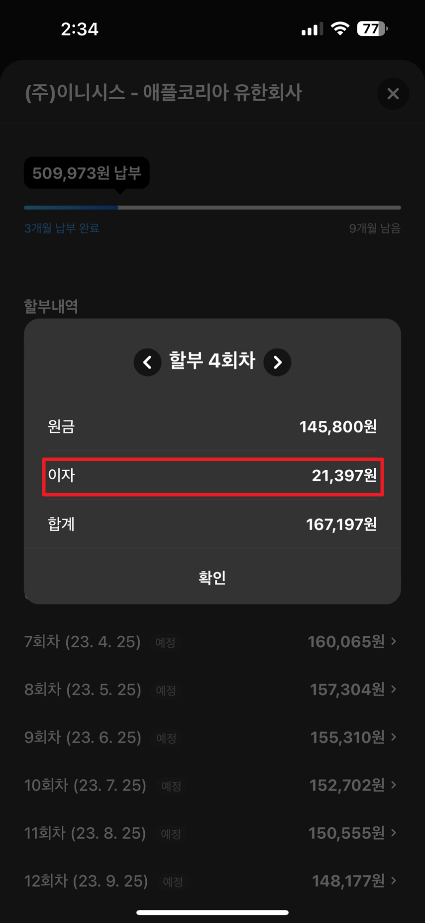 3회차까지 할부를 냈는데 매달 대략 2만원씩 이자가 나가고 있었습니다. 사정이 있어 할부한 것도 아닌 한방에 결제되는 금액이 아까워 할부를 했었는데 무이자가 아니었습니다. 과거에 저로 인해 돈을 또 버리고 있었습니다.