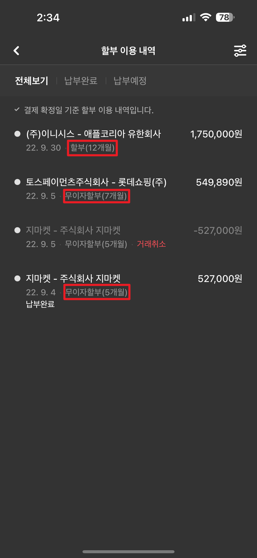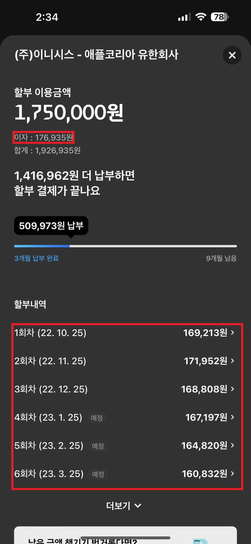 할부를 모두 갚고 확인해 보니 이자를 총 73,553원을 냈네요.