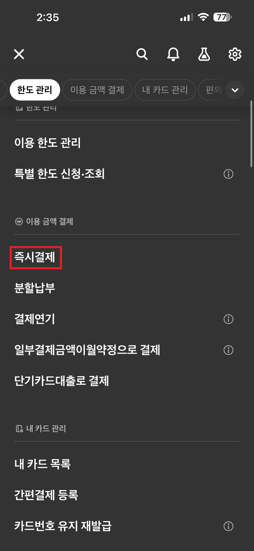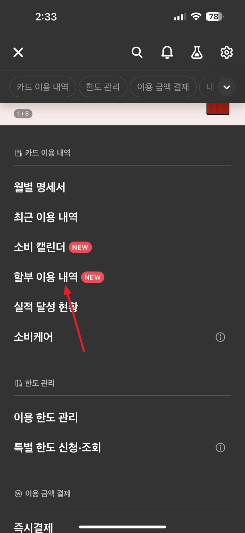 이자로 3달동안 2만원 총6만원이 그냥 나갔었네요. 여태까지 확인을 못 했다는 저 자신을 탓하면서 바로 이자가 지출되는 할부를 한방에 결제해 버리려고 합니다. 할부로 내는 금액을 갚으시려면 메뉴 중 즉시결제 메뉴를 선택하시면 됩니다.