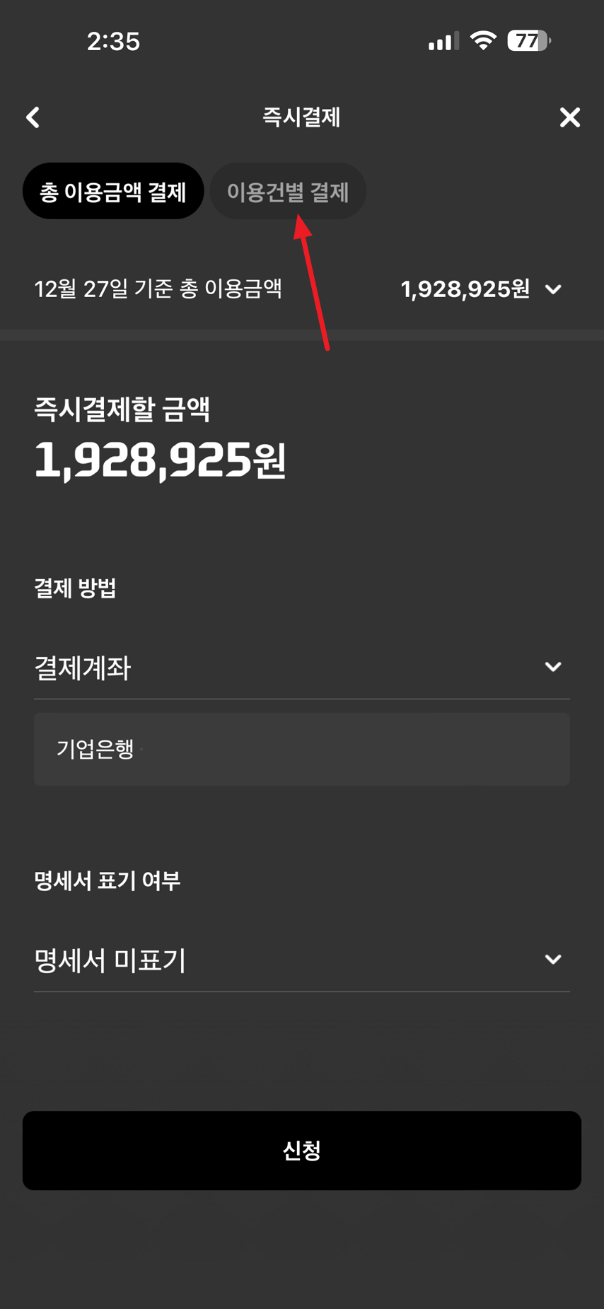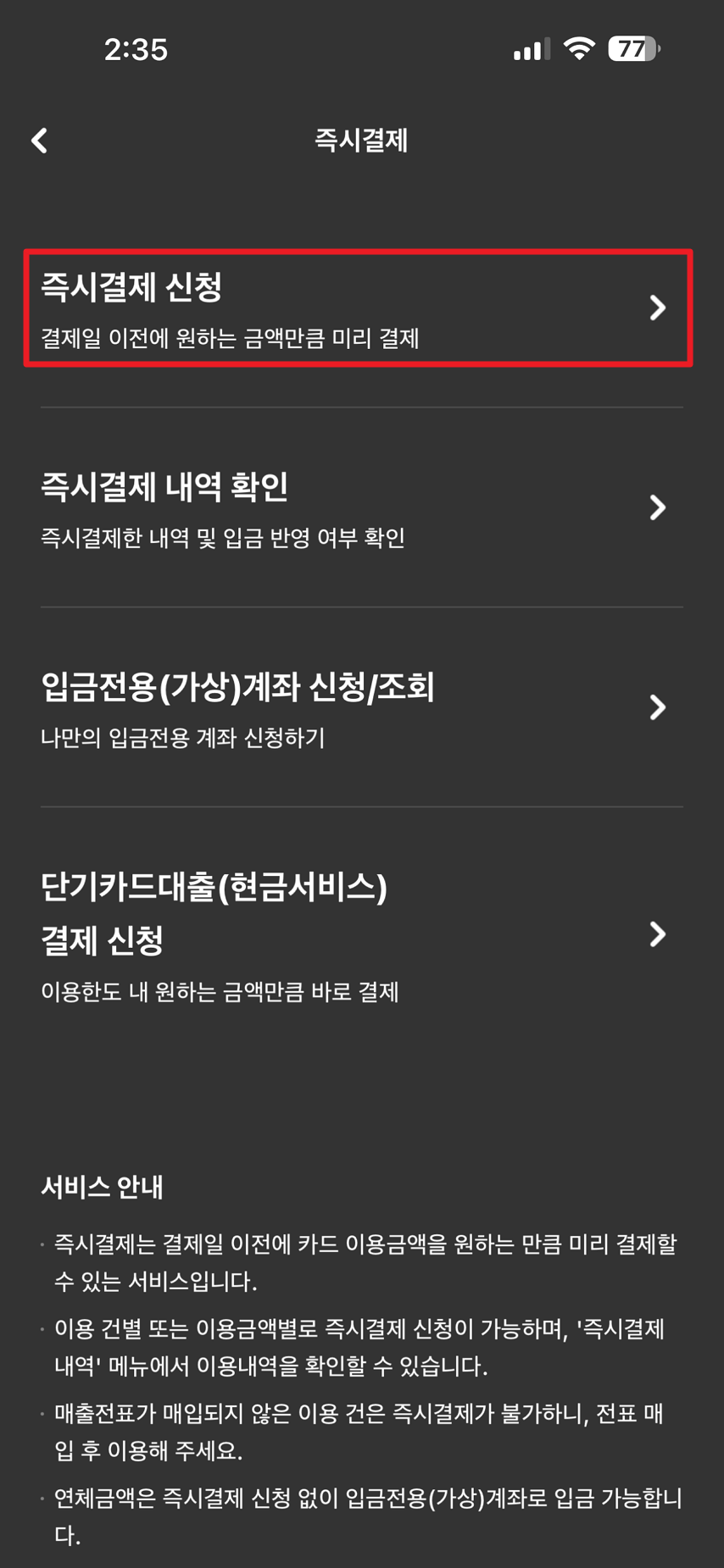 그리고 즉시결제 신청 메뉴 선택.