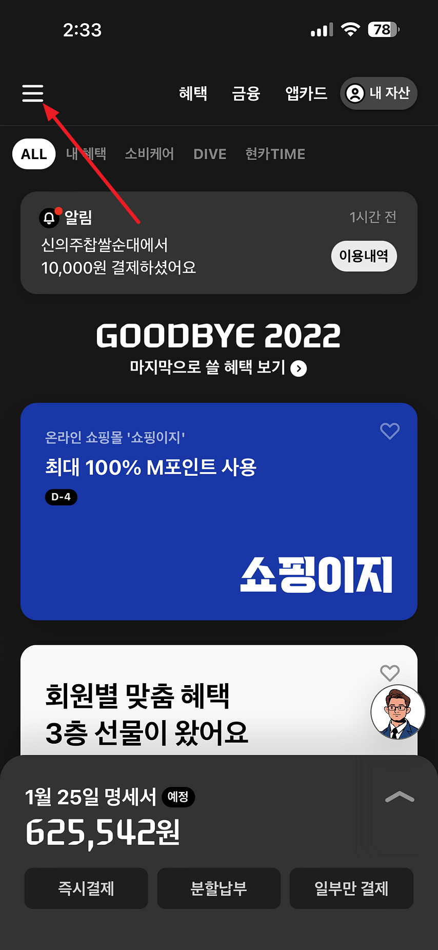 현대카드를 사용해 할부로 결제한 내역이 있어 할부가 얼마나 남았는지 확인해 보려고 현대카드 앱을 실행했습니다. 현대카드 앱을 통해 할부 명세를 확인하시려면 앱 실행 후 메뉴 버튼을 누르시면 됩니다. 작성한 내용은 아이폰 환경에서 현대카드 앱을 실행해 작성된 것이며 스마트폰 기기나 버전에 따라 작성 내용이 다를 수 있으니 이 부분은 참고하시면 좋을 듯합니다.