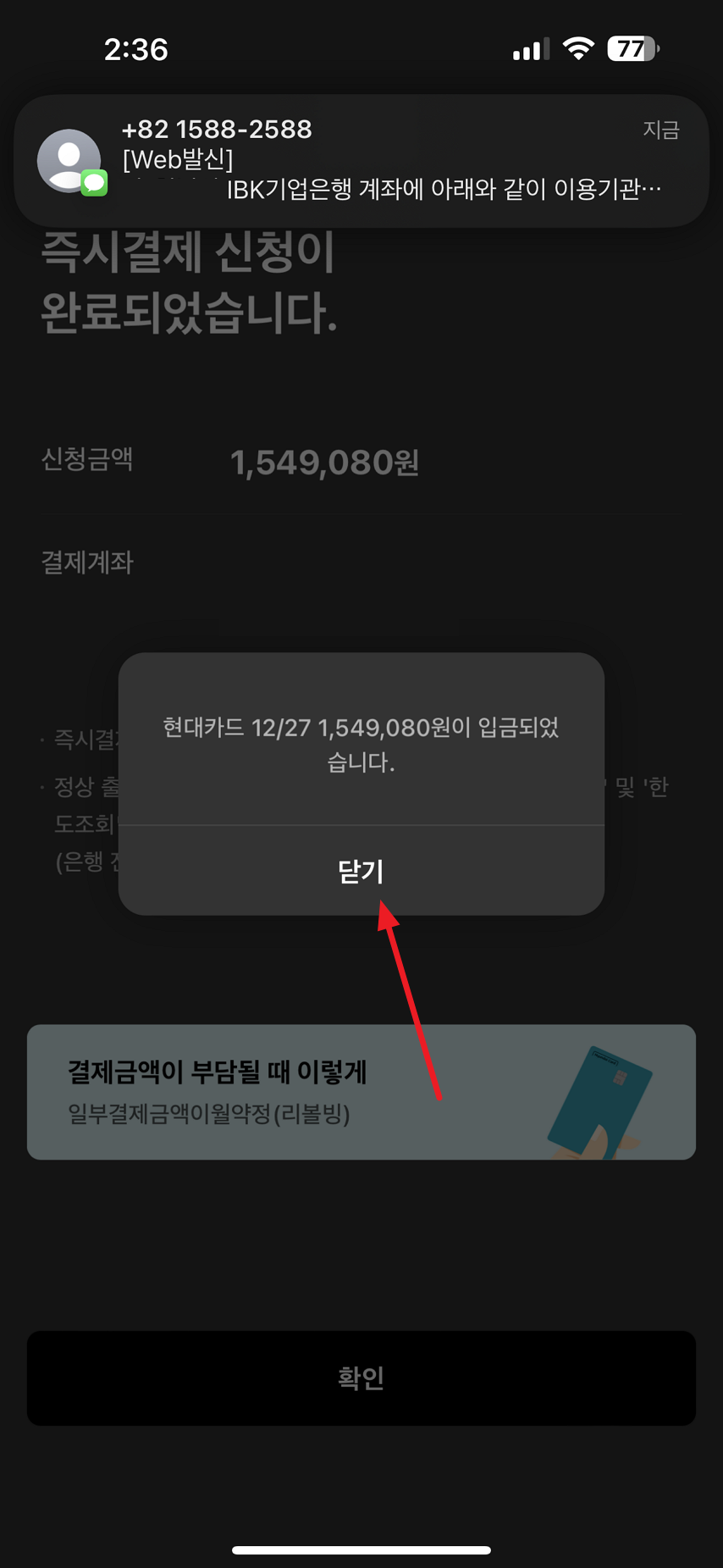 신청이 완료되면 아래 이미지와 같이 표시되게 되며 연결 계좌에서 돈이 바로 빠져나가게 됩니다. 드디어 매달 이자가 나가는 할부를 한방에 갚아 버렸습니다.