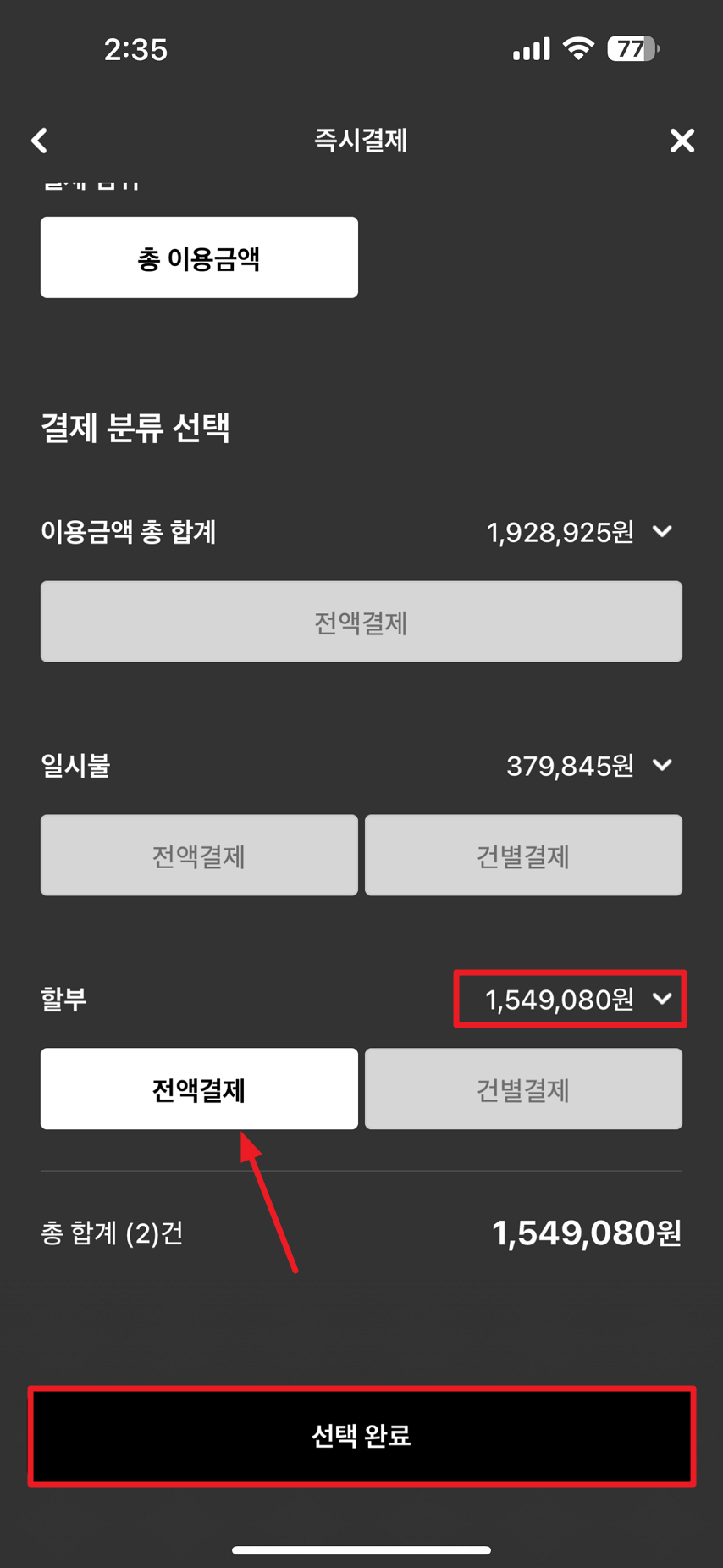 그럼, 이용 금액별로 할부를 사용하고 있는 내용들이 표시되게 됩니다. 금액만 표시되기에 할부가 많으신 분은 구분이 조금 어려울 수 있겠지만 총금액으로 구분해 갚으실 할부를 선택하시고 전액 결제 메뉴를 선택 후 선택 완료를 선택하시면 됩니다.