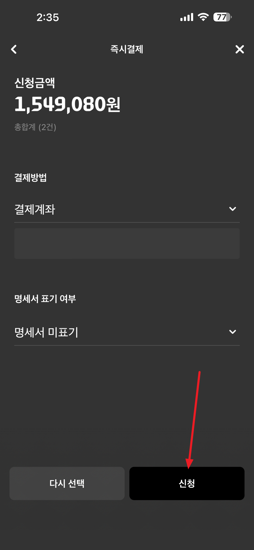 즉시 결제 내용엔 신용카드와 연결된 결제계좌가 표시되며 결제 계좌에 돈이 있다면 신청 버튼을 선택하시면 됩니다.