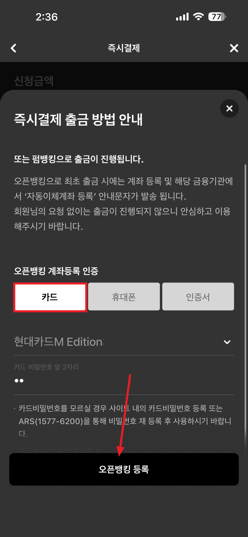 출금이 진행될 때 출금 동의 과정이 필요합니다. 저는 카드 인증을 통해 카드 비밀번호 2자리 입력 후 오픈뱅킹 등록 버튼을 선택해 진행했습니다.