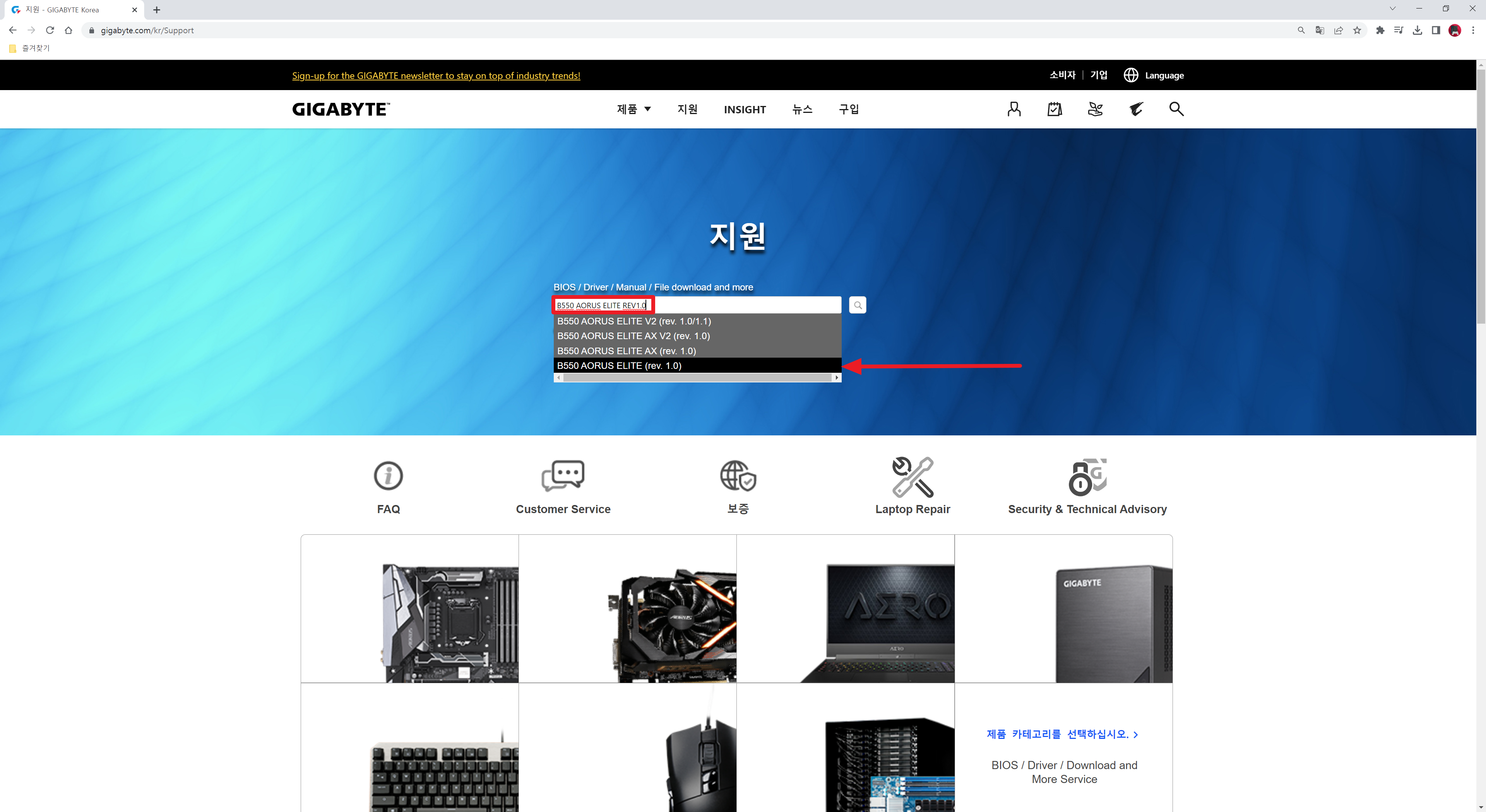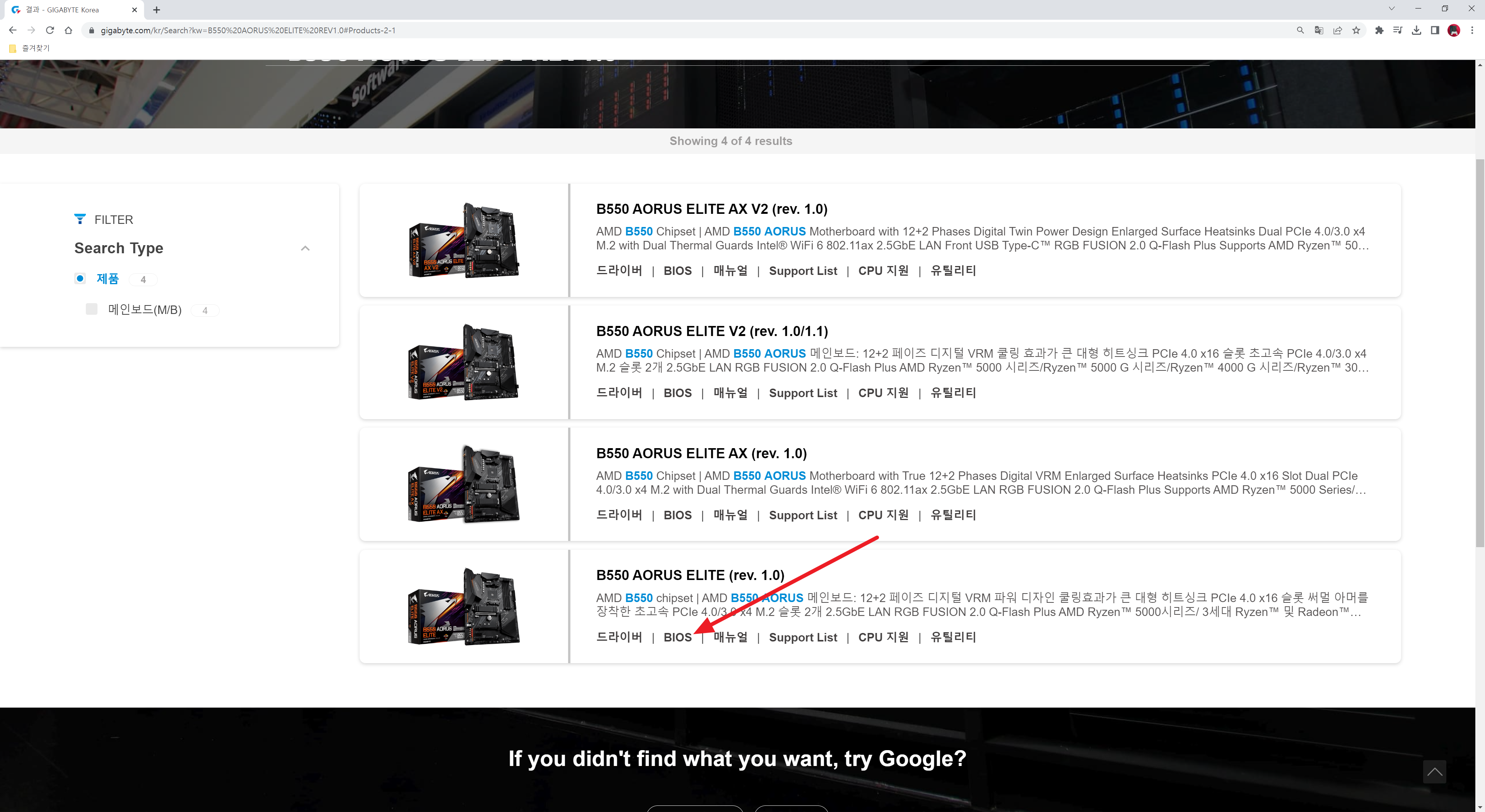 구매한 메인보드의 정확한 이름과 정확한 버전인 B550 AORUS ELITE (rev. 1.0)에 BIOS 링크를 선택 하시면 됩니다.