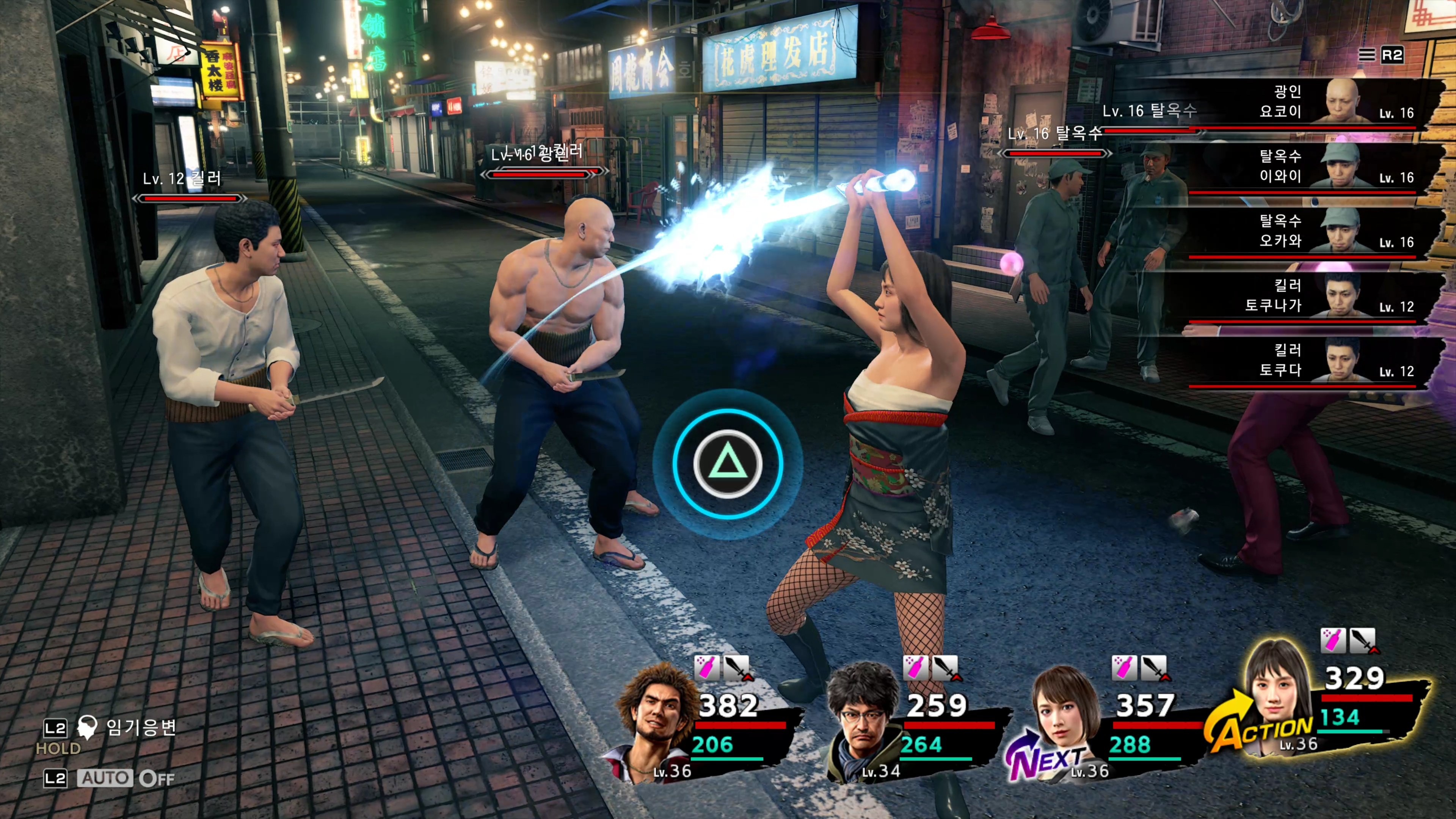 용과같이 7은 턴제 시스템으로 전투가 이루어집니다. 중간중간 박진감을 더하고자 공격 타이밍에 맞춘 커맨드 입력이 있지만 예전처럼 실시간으로 시원한 전투가 이루어지는 것은 아니라서 박진감과 시원한 맛은 떨어졌지만, 직업별로 다양한 스킬을 사용하는 재미와 한방에 적을 쓸어버리는 시원한 스킬들도 많아 전투도 꽤 재밌었습니다.