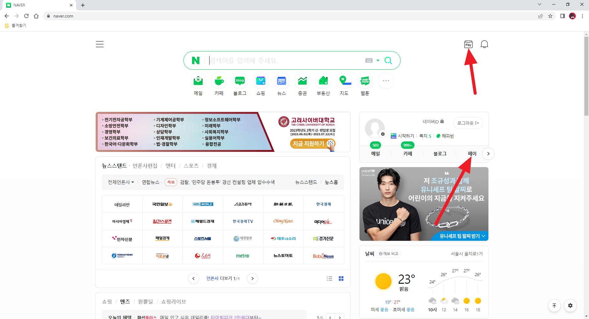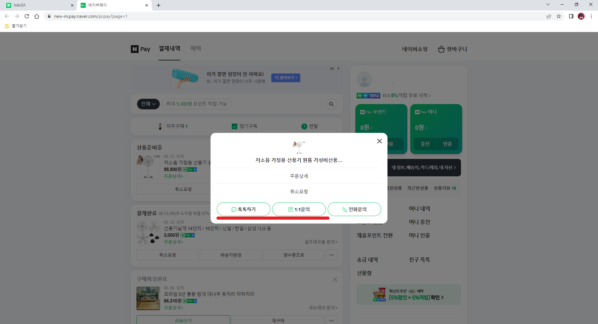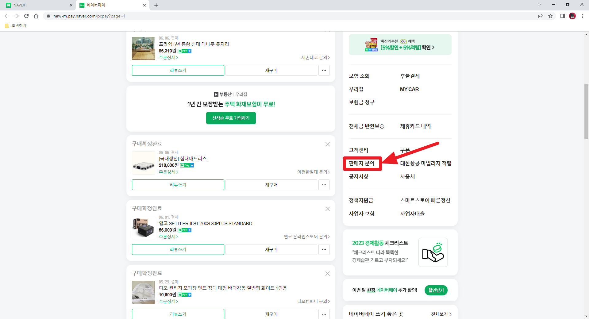 인터넷에서 구매한 물건을 자주 문의 하는 편은 아니지만 물건의 사용법, 상품 파손, 배송 관련 문의를 주로 합니다. 불만이 많았던 제품은 전화를 가끔 하는 경우도 있었지만 주로 메시지를 통해 판매자에게 문의 합니다. 인터넷을 통해 글을 남겨 놓으면 판매자들이 답변을 잘 달아 주셔서 개인적으론 자주 활용하고 있습니다. 네이버 페이를 통해 결제하셨다면 아래 이미지와 같이 네이버 사이트에서 네이버 페이 아이콘을 눌러 주시면 됩니다.