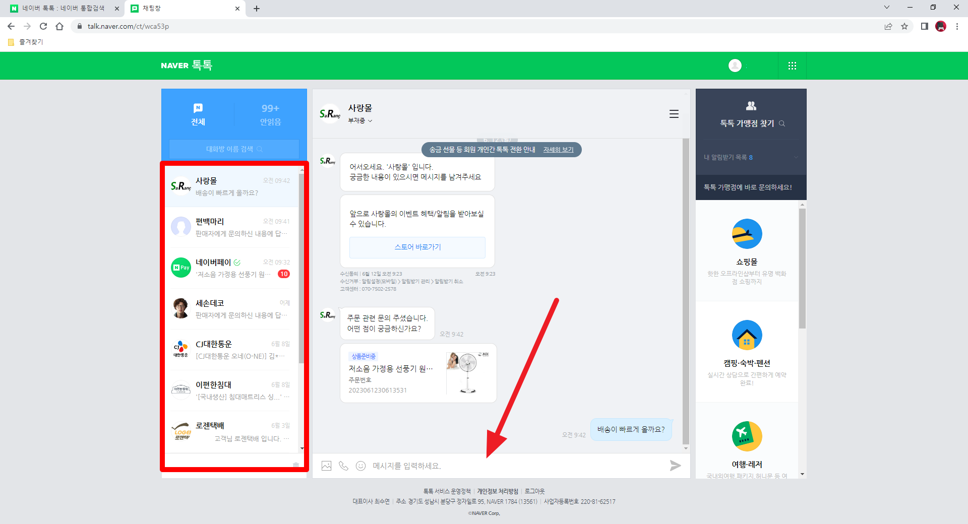 그럼, 네이버 톡톡에서 나눴던 채팅창 문의를 업체별로 확인할 수 있으며 왼쪽에서 판매자를 선택하시면 새롭게 문의를 남길 수도 있으며 이전에 문의했던 내용도 쉽게 확인하실 수 있습니다.