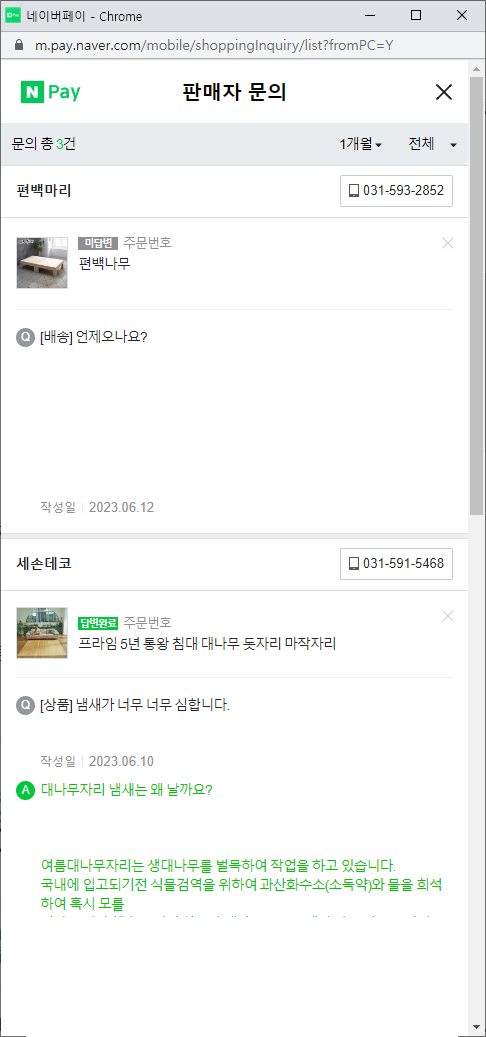 각각의 판매자에게 남겼던 문의 내용을 리스트 형태로 한 번에 확인할 수 있어 편합니다. 이곳에서 판매자 연락처도 확인할 수 있긴 하네요.