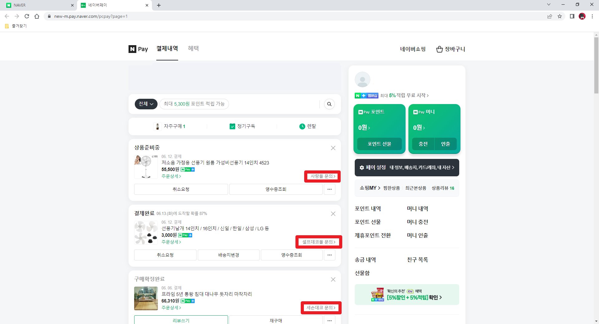 네이버 페이를 통해 구매하신 물건이라면 아래 이미지와 같이 구매한 상품의 판매자에게 각각 문의를 남기실 수 있습니다.