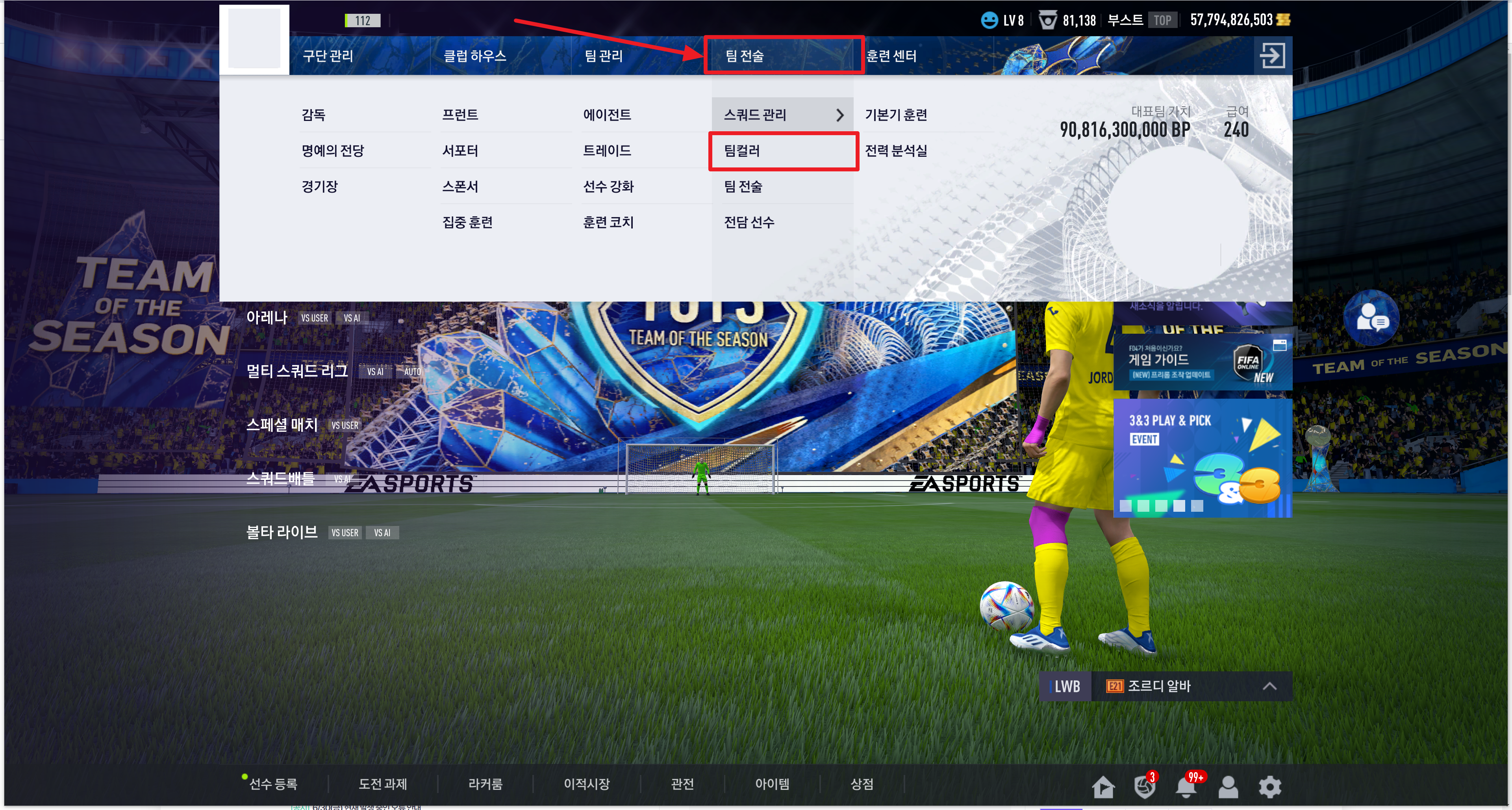 스쿼드 메뉴가 A, B, C로 나뉘어져 있는데 팀컬러용 스쿼드는 C에 저장하였고, 기존 스쿼드는 A에 저장했습니다. 직접 게임을 할 떈 스쿼드만 A로 바꾸고 팀컬러를 깨기 위해 감독 모드를 진행할 땐 스쿼드를 C로 바꾸기만 하면 되니 편했습니다.