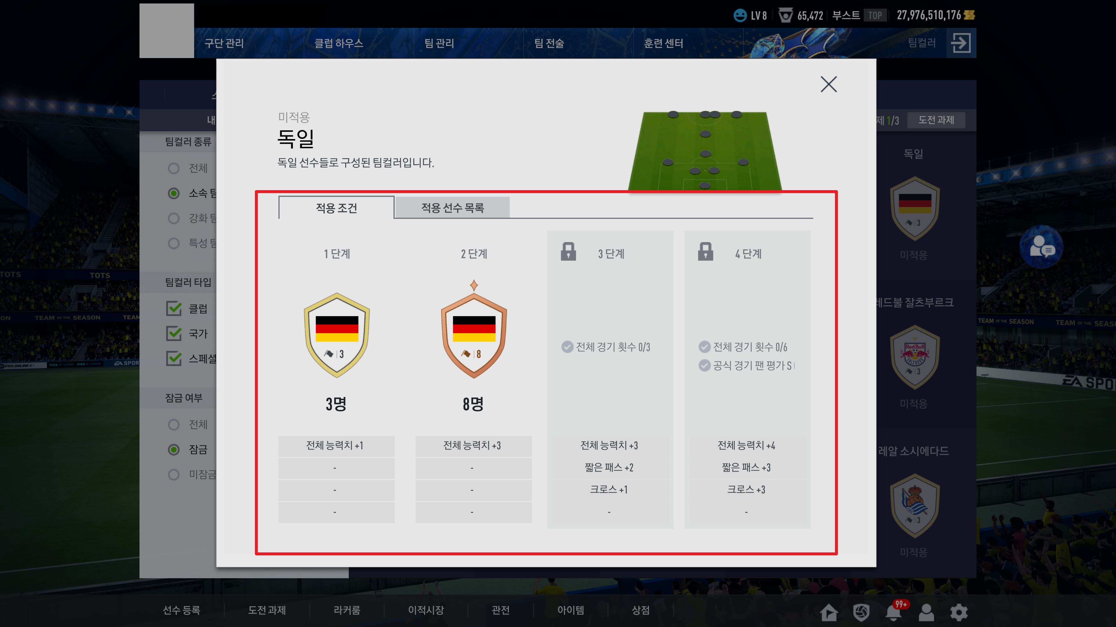 팀컬러 1단계 도전과제 미션을 해결하기 위해 독일 주축으로 진행해 보려고 합니다. 3단계, 4단계 잠금을 해제하려면 전체경기 횟수와 팬 평가 S를 받아야 하는군요. 팀컬러 목록 중 4단계까지 표시안된 팀들도 있습니다. 팀컬러 미션을 깨기 위해서는 4단계까지 표시되어 있는 팀컬러 팀으로 진행하셔야 합니다.