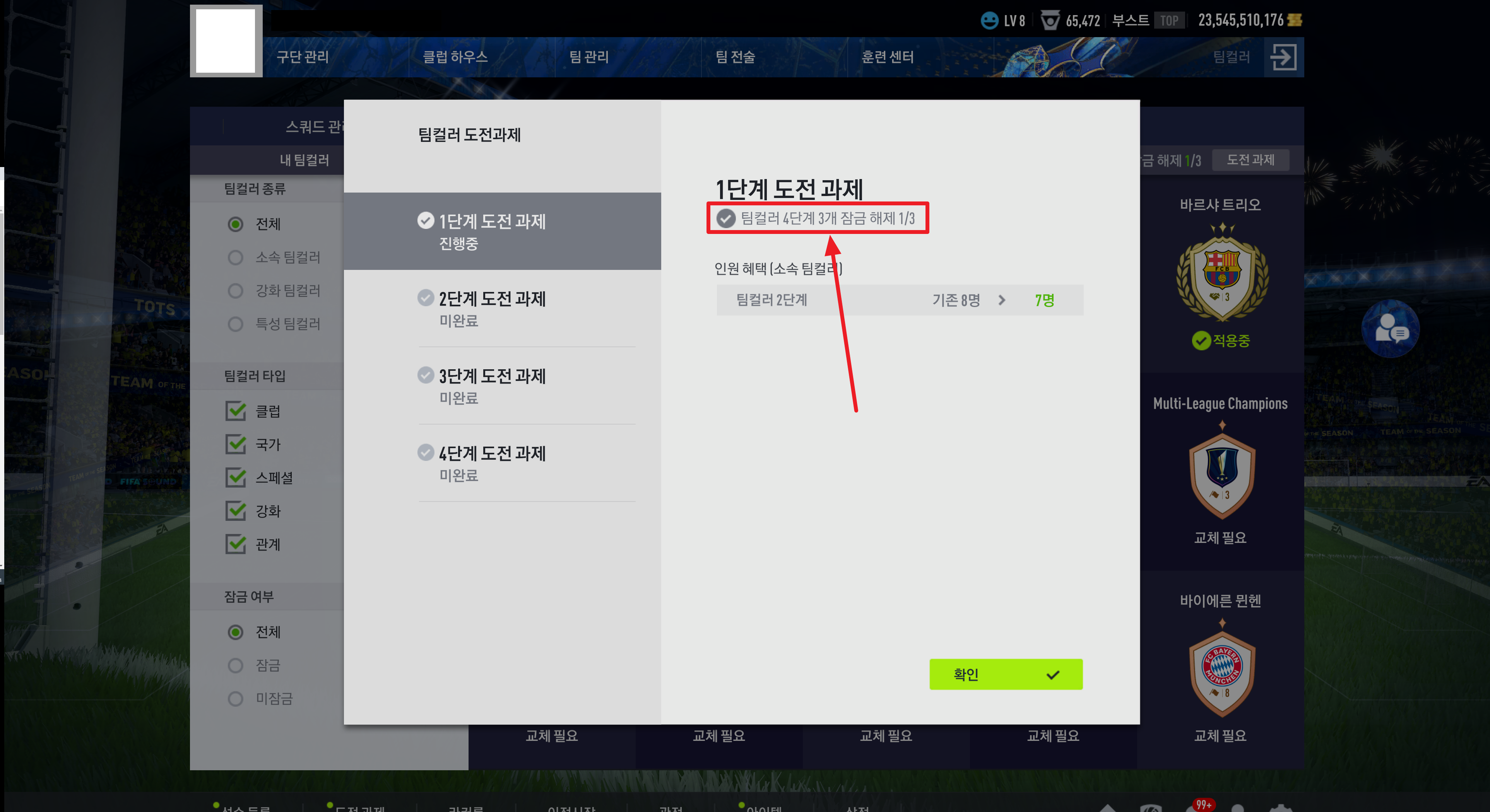 아래 이미지와 같이 4단계까지 잠금 해제한 팀컬러 팀이 총 3팀이 필요한데 추가로 2개의 팀이 부족해 도전과제 미션이 깨지지 않고 있습니다. 어떤 팀컬러를 4단계까지 깨야 할지 확인해 보겠습니다.