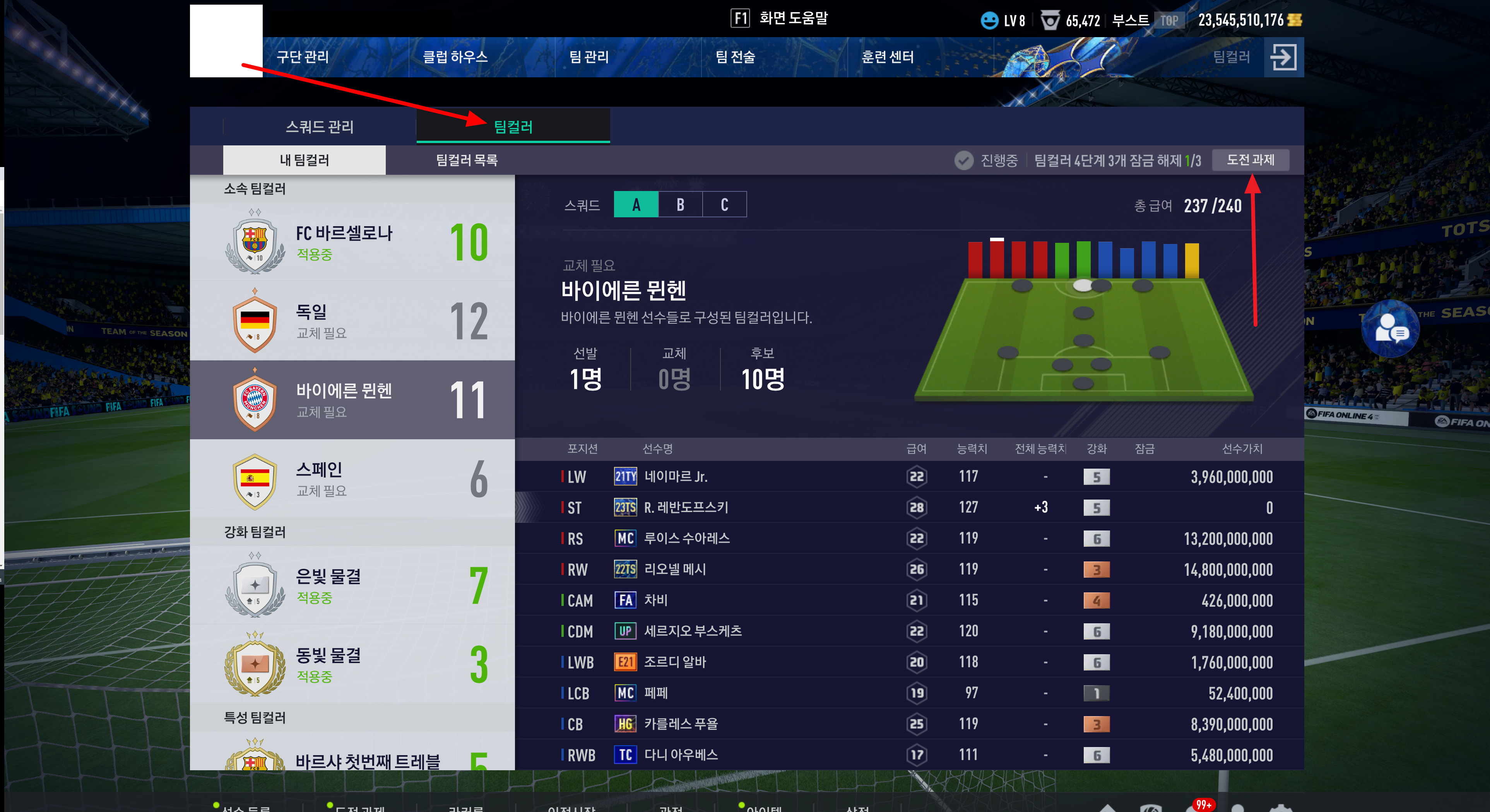 이적시장 상세 검색 메뉴에서 팀컬러 메뉴 중 소속 팀컬러 선택 후 독일을 선택해 값이 제일 저렴한 11명의 독일 선수를 영입했으며 240 급여를 맞추기 위해서 급여 부분도 15~20까지로 상세 검색을 하시면 편합니다.