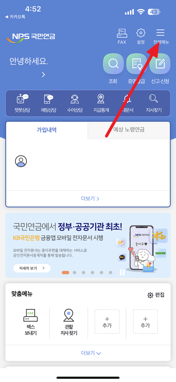 전체 메뉴에서 다음과 같은 화면이 나오게 되는데 왼쪽 조회 메뉴 → 가입내역 메뉴 선택 하시면 됩니다.